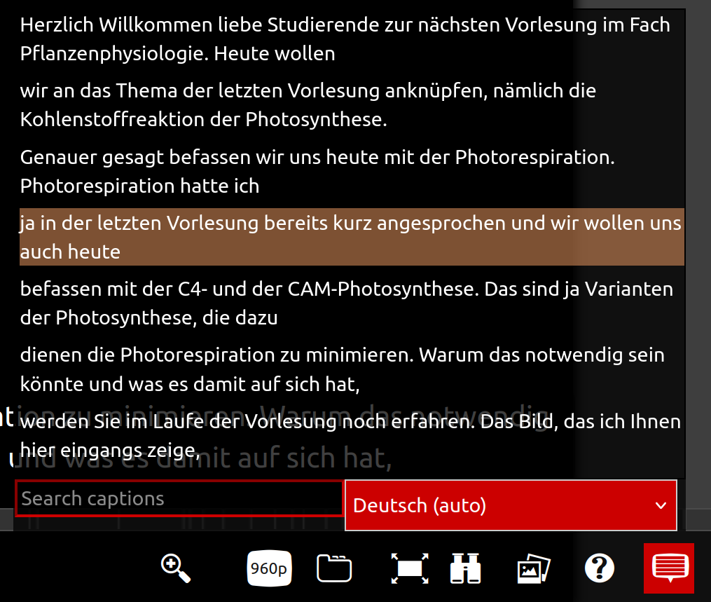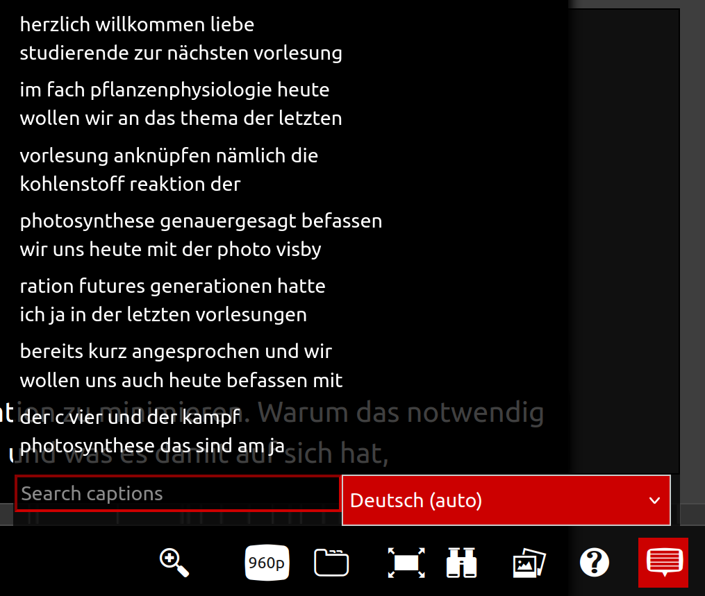 - Ggf. erscheinen zunächst die altbekannten, schlechteren Untertitel ohne Groß- und Kleinschreibung, wenn es sich um ein über Stud.IP und Opencast Studio hochgeladenen Video handelt.
